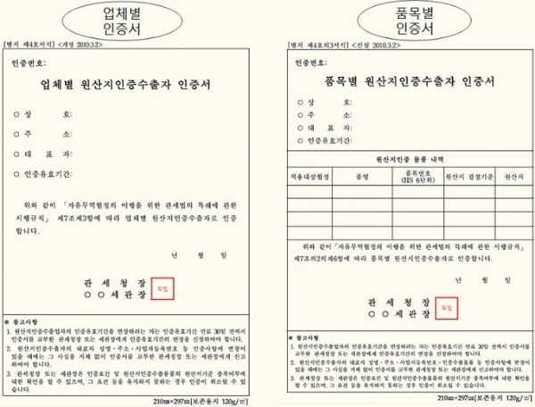 * 원산지인증수출자 조건 구분 | 업체별 원산지인증수출자 | 품목별 원산지인증수출자 | PROCESS | 전산 시스템 업무 매뉴얼 등을 구비 - 원재료 관리, 원산지 판정, 원산지증명서 발급, 관련 서류 보관 | 원산지 결정기준을 충족하는 물품 (통합품목분류표에 따라 6단위 기준)을 수출 하는자 | SPECIALIST | 원산지증명 능력을 갖춘 원산지 관리 전담자 지정, 운영(외부원산지전문자 지정 가능) | 원산지증명 능력을 갖춘 원산지 관리 전담자 지정,운영(외부원산지전문자 지정 가능) | 서류 보관 | 원산지증명서 관리 대장을 비치 작성 | 원산지증명서 관리 대장을 비치 작성 | 법규 준수 | - 최근 2년간 원산지 검증(법 제13조제2항) 을 거부한 사실이 없는 자 - 죄근 5년간 서류 보관 의무를 위반한 사실이 없는자 - 최근 2년간 속임수 또는 부정한 방법으로 원산지증명서를 발급 신청한 사실이 없는자 | 없음 |