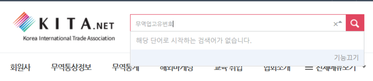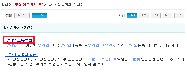 ①한국무역협회 (http://webdocu.kita.net/) 로그인 하신 후 검색창에 "무역업고유번호" 로 검색합니다. 가장 상단에 나오는 "무역업고유번호" 바로가기를 클릭합니다.