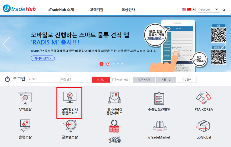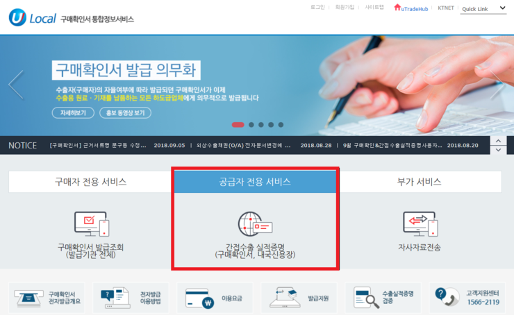 -신청기관: ①대금을 결제한 은행 ②유트레이드허브 (전자무역포털) https://www.utradehub.or.kr uTradehub 회원가입하신 후 구매확인통합정보서비스 메뉴를 클릭합니다. 공급자전용 서비스의 간접수출실적 증명 발급 메뉴를 클릭하여 진행합니다.