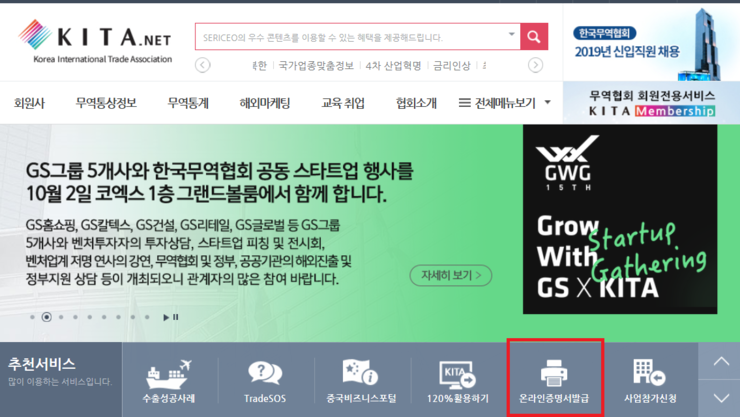 무역업 고유번호가 발급되면, 한국무역협회 홈페이지 메인 화면에서 "온라인 증명서 발급"을 클릭합니다. 한글 수출실적 증명서를 클릭하여 진행합니다.