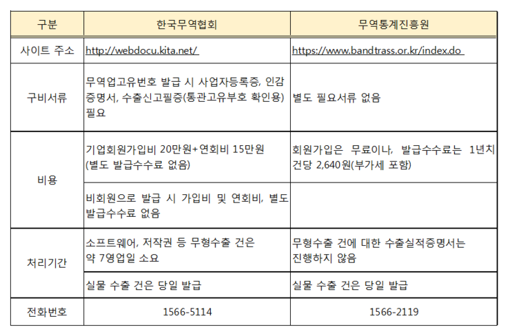 -신청기관은 한국 무역협회와 무역통계진흥원 2곳이 있습니다. 상세 비교내역은 아래 표와 같습니다.