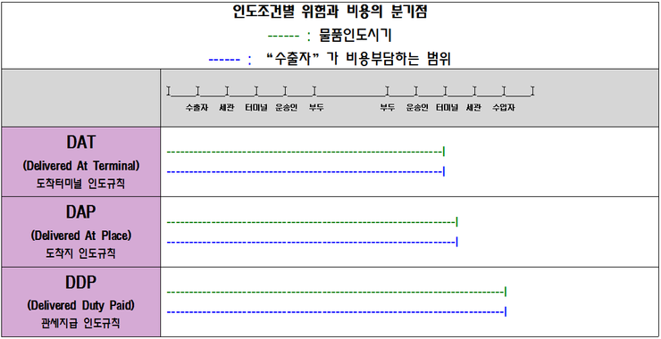 4. “D" 규칙 : DAT, DAP, DDU -수입국 인도조건으로 이 규칙들만 양륙지(수입국)에서 물품의 위험이 수입자에게 이전(=인도)된다.