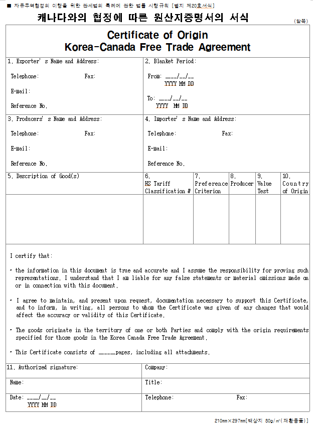 한-캐나다FTA 원산지증명서 양식 첨부합니다. 다운받아서 사용하시면 됩니다.