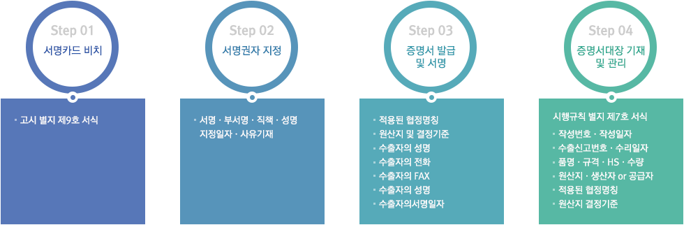 (자율발급) 수출자는 생산자로부터 발급받은 원산지확인서 및 원산지를 확인할 수 있는 서류를 근거로 협정상 서식에 따라 작성 후 서명권자의 서명·날인으로 발급하고 원산지증명서 대장 관리
