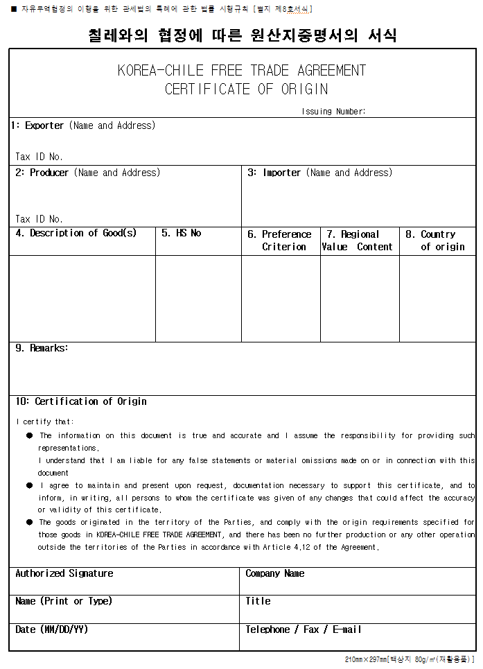10) 하단에 서명권자의 자필 서명 및 기본정보 ( 회사명, 이름, 직위, 날짜, 연락처)를 기재하신 후 칠레 수입자분께 보내시면 됩니다. 한-칠레 FTA 원산지증명서 양식 첨부합니다. 다운받아서 사용하시면 됩니다.
