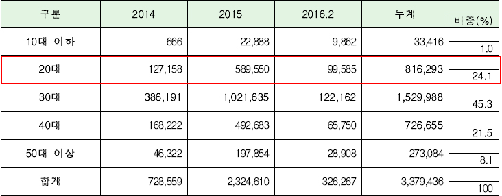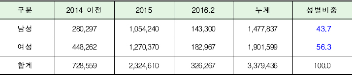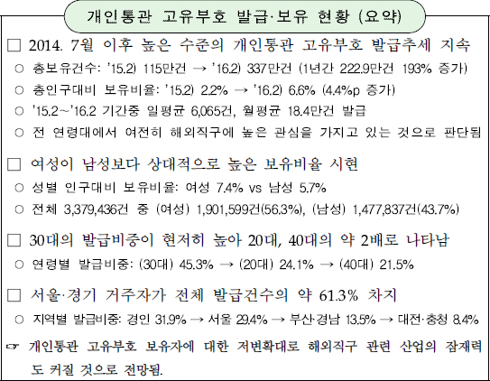 해외직구나 수출입 통관을 진행할 때 주민등록번호 대신 사용하는 개인 식별 부호인 개인통관부호를 우리 나라 전체 인구(2016.2월 기준 5,155만명) 중 약 6.6%인 337만명이 발급·보유하고 있는 것으로 나타났다.
