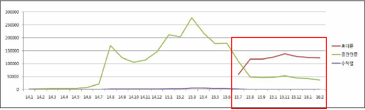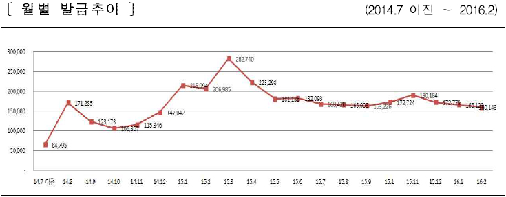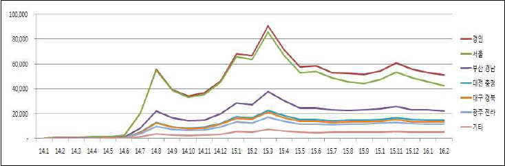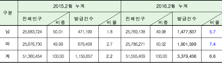 [지역별 발급추이 (2014.1 ~ 2016.2)] [지역별 인구대비 보유 현황] [주요 지역별 발급 현황] [성별·지역별 보유 현황] [연령별·지역별 보유 현황] [신청 방법별 발급 추이]