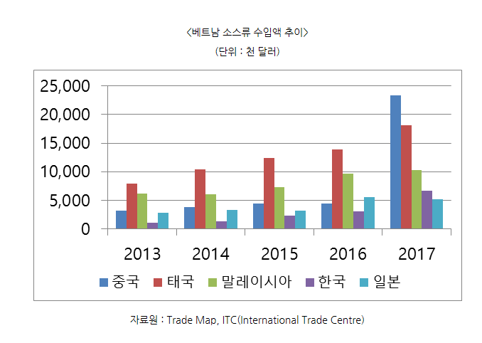 2016년도 까지는 태국에서 가장 많이 수입하였으나 2017년도 중국에서의 수입이 500% 이상 증가함에 따라 전체적인 수입 규모도 150% 이상 증가하였습니다.