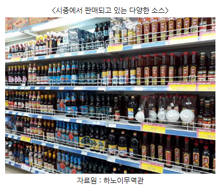 매년 성장세를 보이는 베트남의 소스 시장 유로모니터의 보고서에 따르면 베트남의 소스 시장은 매년 5% 이상의 성장세를 보이고 있다고 합니다. 2016년은 2015년 대비 8%, 2017년은 2016년 대비 9%가 상승하였으며 2018년에는 더욱 큰 성장세를 보일 것으로 예상하고 있습니다. 이러한 성장세를 보이는 주 된 이유로는 베트남 젊은 층의 사회진출 증가 및 노동 시간의 증가로 인해 요리 시간 단축이 가능한 소스 이용 증가하였기 때문이라고 하는데요 특히 베트남은 Lau(베트남식 샤브샤브)가 가장 보편적인 회식 음식이며 집에서도 자주 요리를 해서 먹고 있는 식품이며 이 샤브샤브에 들어가는 국물에 들어가는 인스턴트 소스가 크게 인기라고 합니다. 소스 종류별 유통규모 베트남 대표 소스인 생선소스(느억맘)의 소비량이 가장 많으며 매년 7% 이상 꾸준한 성장세를 보이고 있다고 합니다. 생선소스 외 간장, 칠리, 굴소스, 마요네즈 순으로 소비량이 높고, 주요 소스와 비교하여 소비량이 높진 않지만 17% 이상의 성장세를 보이는 샐러드 드레싱도 주목할 만 합니다.