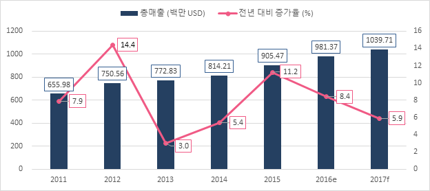 ▶베트남 의료기기 수입 및 수출동향 -베트남 의료기기 수입액은 2008년 이래 지속 증가했으며, 2016년에는 전년대비 20.7% 증가해 9억 9400만 달러에 달성하였다.